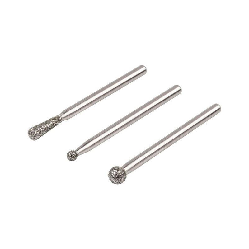 Set 3 muelas de diamante esféricas y cónicas. las minimuelas de diamante esféricas y cónica es posible realizar trabajos finos, como grabar, mecanizar contornos y desbarbar. el juego contiene dos minimuelas esféricas con diámetros de ø3 y 5 mm así como una minimuela cónica con diámetro de 3,5 mm. con su recubrimiento de diamante, son perfectas para mecanizar materiales duros, como cerámica, vidrio, azulejos y metales no ferrosos, y convencen gracias a su alta estabilidad dimensional y larga vida útil. con su vástago de 3 mm, las minimuelas de diamante pueden montarse fácilmente en taladros, atornilladores de batería, ejes flexibles y miniamoladoras