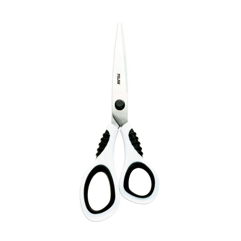Blister con tijeras de oficina blancas milan. tijeras de oficina con cuchilla de acero inoxidable. mango de plástico blanco con detalles negros, resistente a los golpes y ergonómico. medidas: 20,5cm
