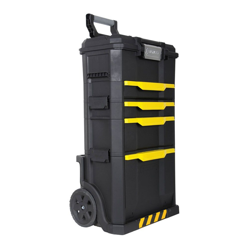 Taller móvil sistema modular. cajonera con 2 cajones, uno de poca profundidad para accesorios pequeños y otro con más profundidad para accesorios mayores y guias de rodamiento de bolas. contenedor con tapa abatible de gran capacidad para herramienta electrica, niveles etc. mango telescópico en aluminio. bolsillos traseros para herramientas largas, como niveles y serruchos