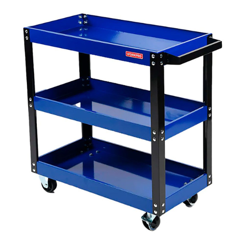Carro de herramientas con 3 bandejas, estructura completa de metal, robusto y duradero - pintado al horno, resistente al uso y a la corrosión, más espacio de almacenamiento, ruedas de pp, sistema de freno - capacidad máxima de carga por bandeja: 25 kg - color: azul y negro, dimensiones: 75,5 x 35,5 x 70,5 cm