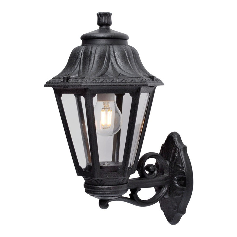 Farol de pared con brazo, modelo bisso/anna, color negro con cristal transparente, tensión 220 - 240 v ~50/60 hz, casquillo e27, máximo 23 w, longitud máxima bombilla 130 mm, bombilla no incluida, grado de protección ip55, hecho de resina resistente uv, anticorrosión y antióxido. incluye elementos de fijación. 220 x 275 x 450 mm