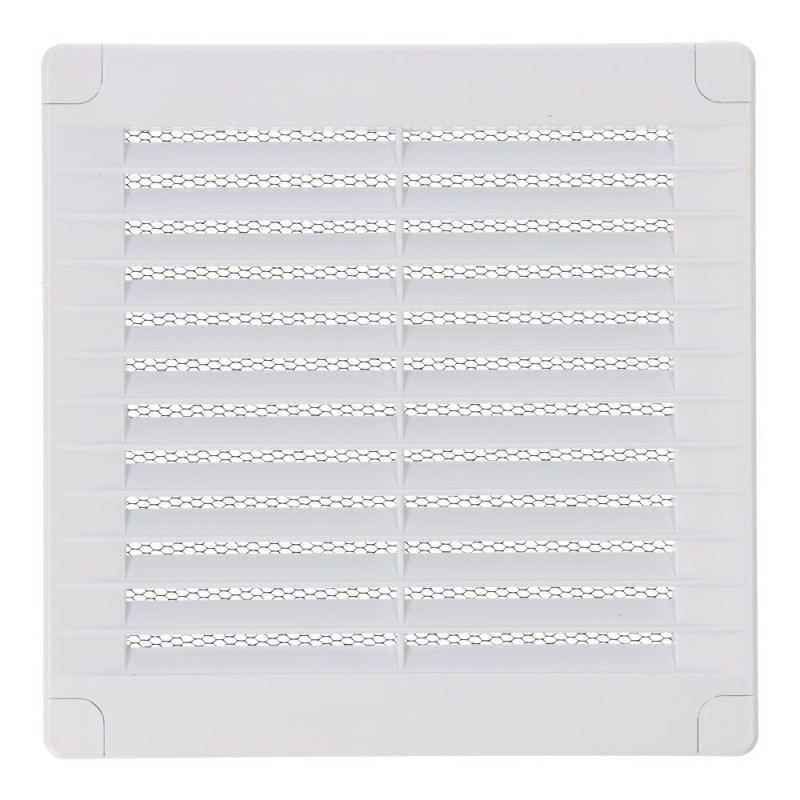 Rejilla ventilación de plástico, cuadrada con tapones y mosquitera 150x150x7mm blanca